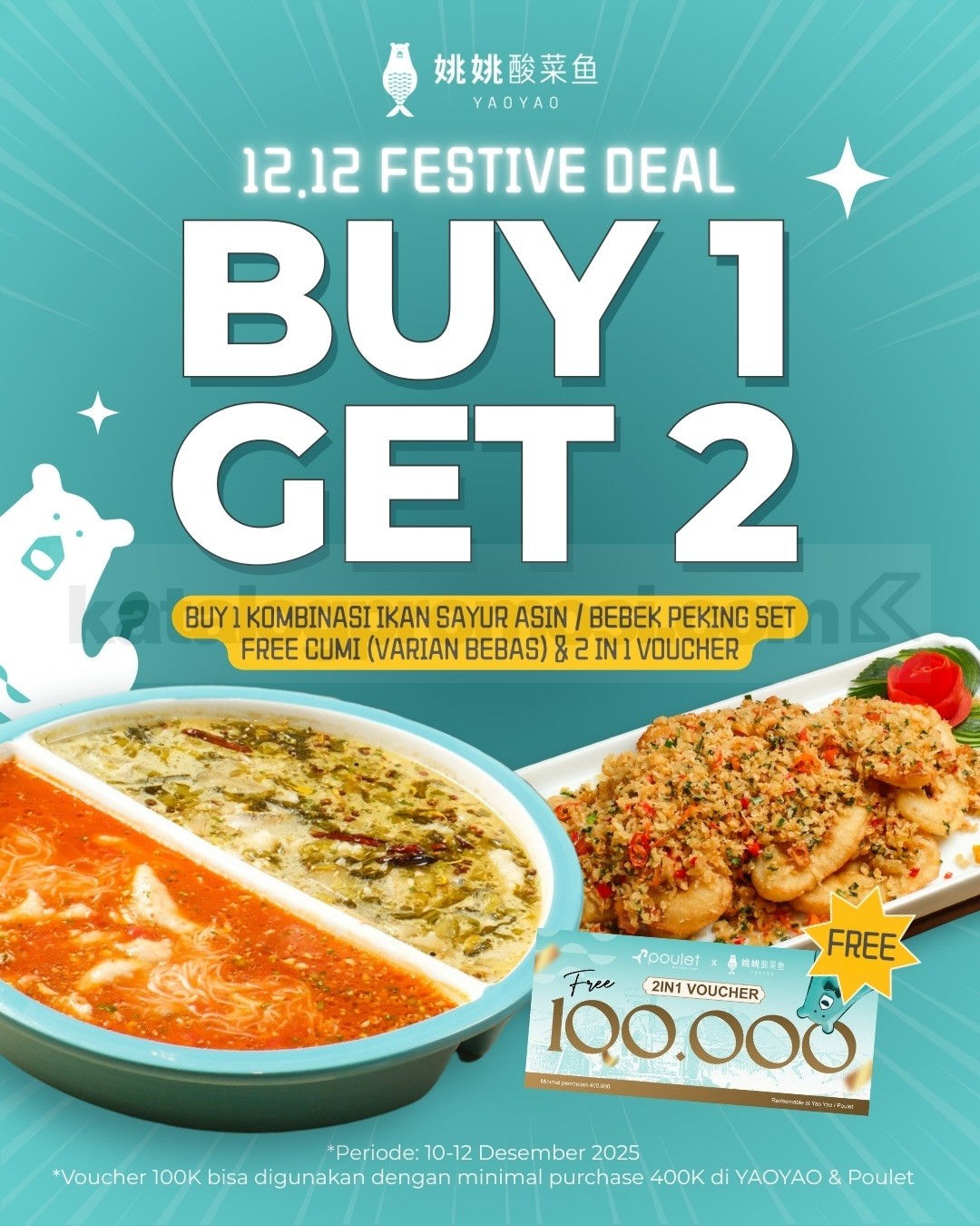 Promo Yaoyao 12.12 Festive Deal Buy 1 Get 2 berlaku 10–12 Desember 2025 dengan free cumi dan bonus voucher Rp. 100.000 untuk pembelian menu set tertentu.