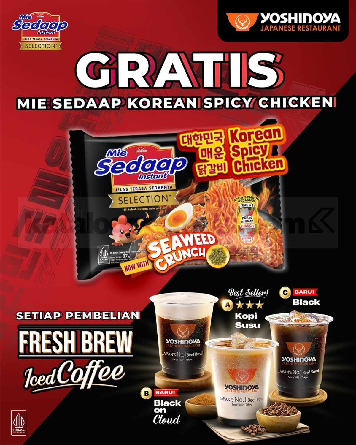 Ngopi santai makin seru karena ada Promo Yoshinoya Gratis Mie Sedaap Korean Spicy Chicken! Jadi, tiap kamu beli Fresh Brew Iced Coffee di Yoshinoya (mau yang Kopi Susu, Black, atau Black on Cloud), kamu langsung dapet bonus mie pedas favorit banyak orang: Mie Sedaap Korean Spicy Chicken! ππ₯