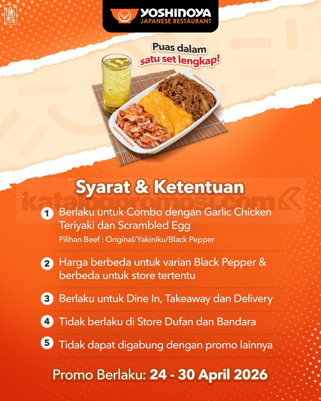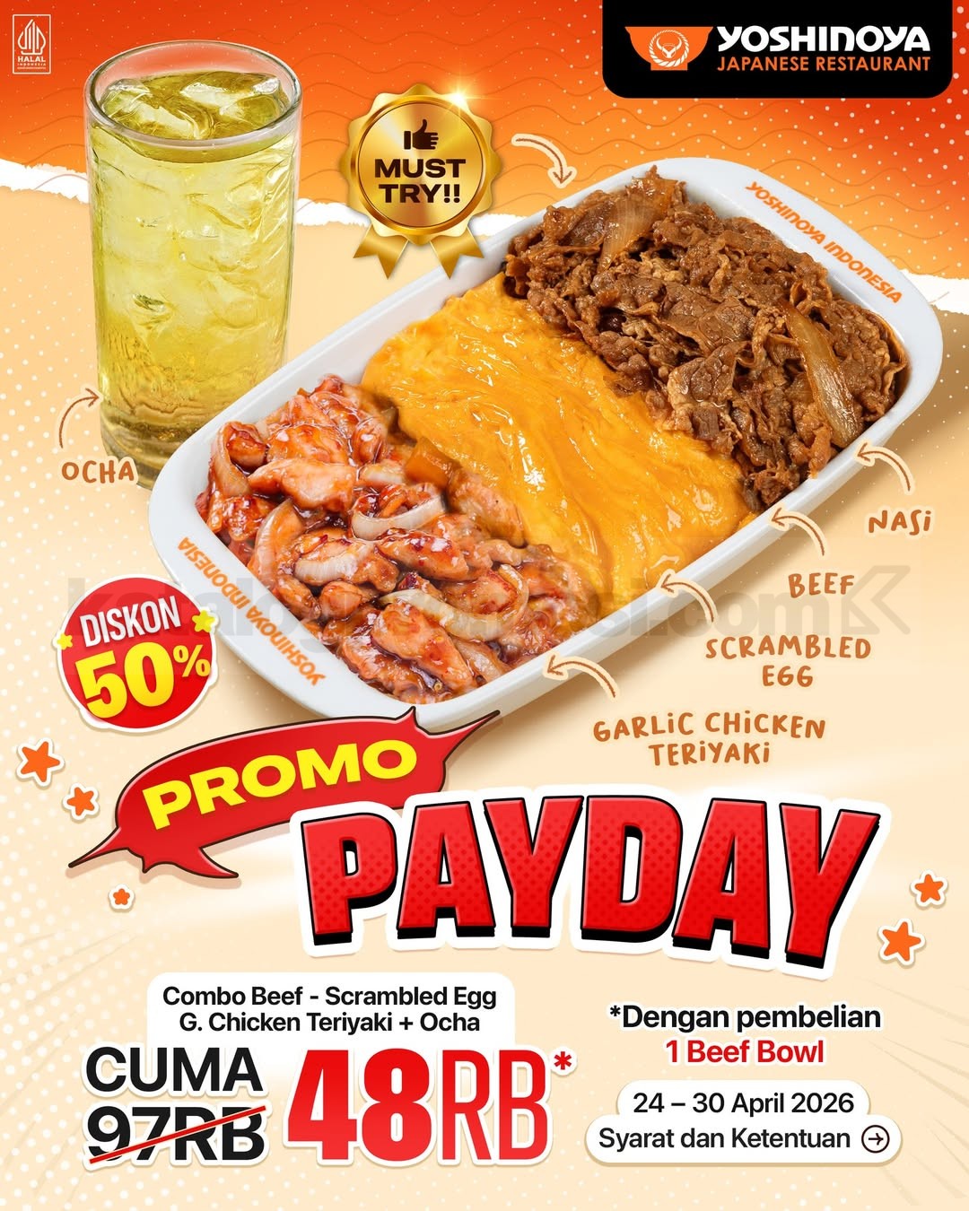 Promo Yoshinoya Payday Menu Combo Diskon 50% Combo Triple Protein Rp. 48.000 berlaku 24 April 2026 – 30 April 2026 untuk dine in takeaway dan delivery