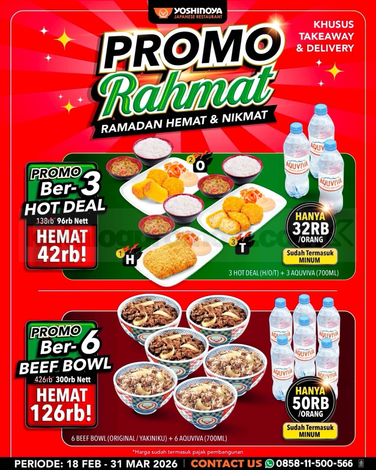 Promo Yoshinoya Rahmat Bukber mulai Rp. 32.000 per orang dengan paket ber-3 dan ber-6, takeaway dan WhatsApp Delivery, berlaku mulai tanggal 18 Februari 2026 – 31 Maret 2026.