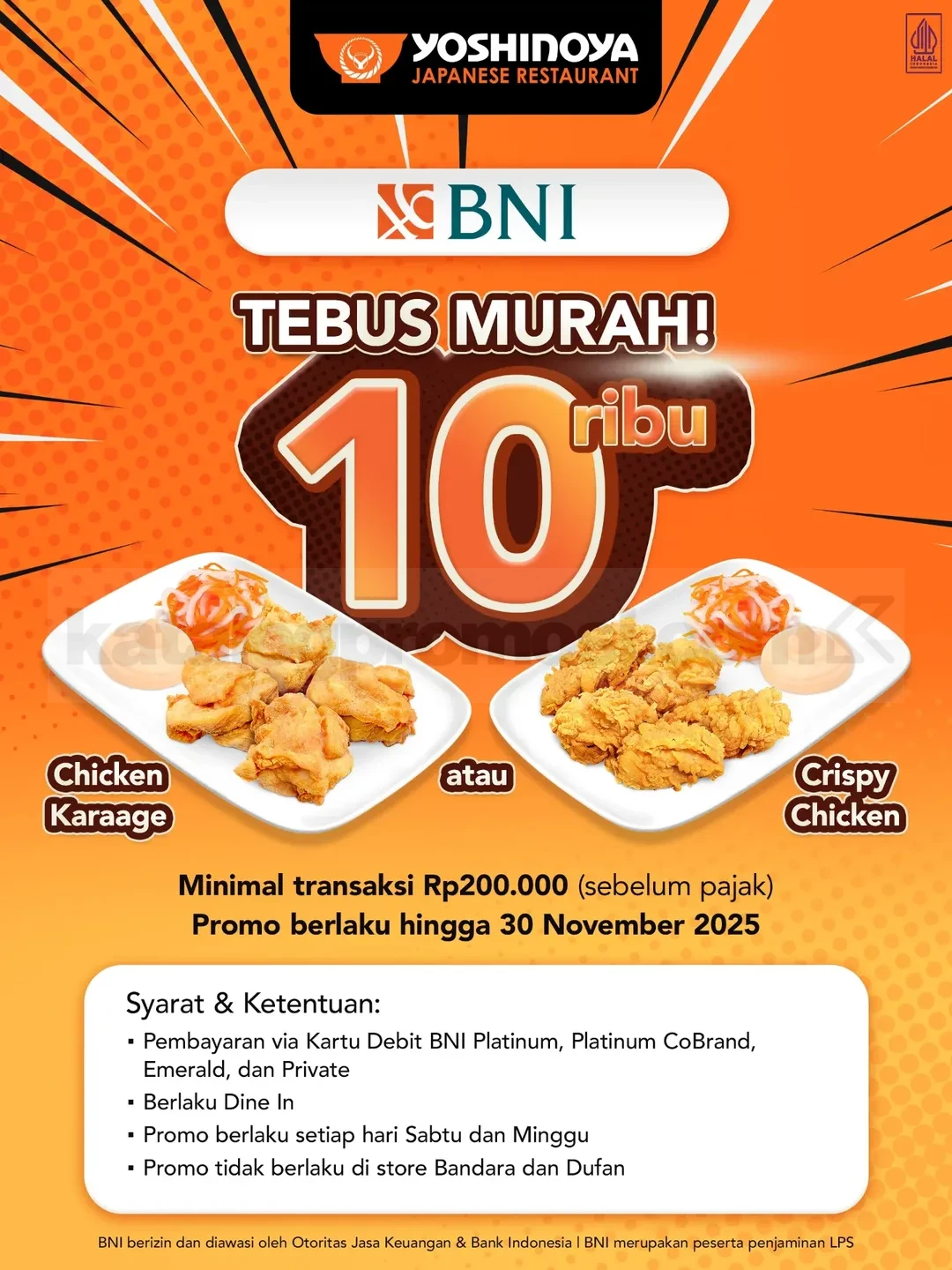 • Tebus murah Rp10.000 – BNI Debit (hingga 30 Nov 2025, min. Rp200.000, menu Chicken Karaage/Crispy Chicken, Sabtu & Minggu, dine in).