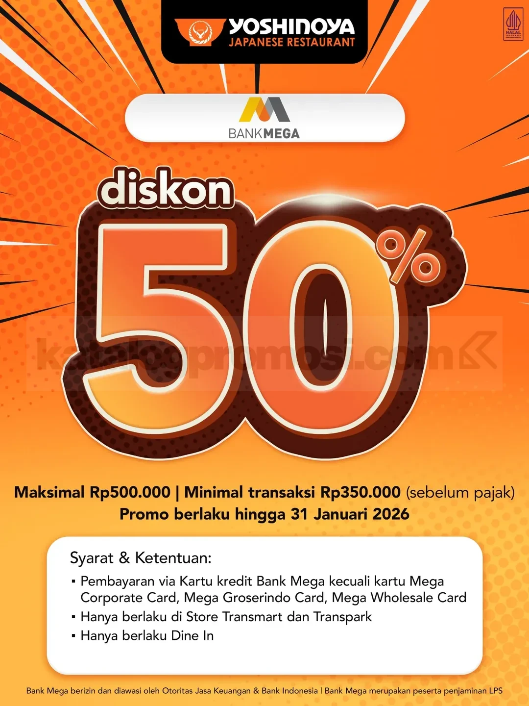 • Diskon 50% – Bank Mega Credit Card (hingga 31 Jan 2026, min. Rp350.000, hanya di Transmart & Transpark, dine in).