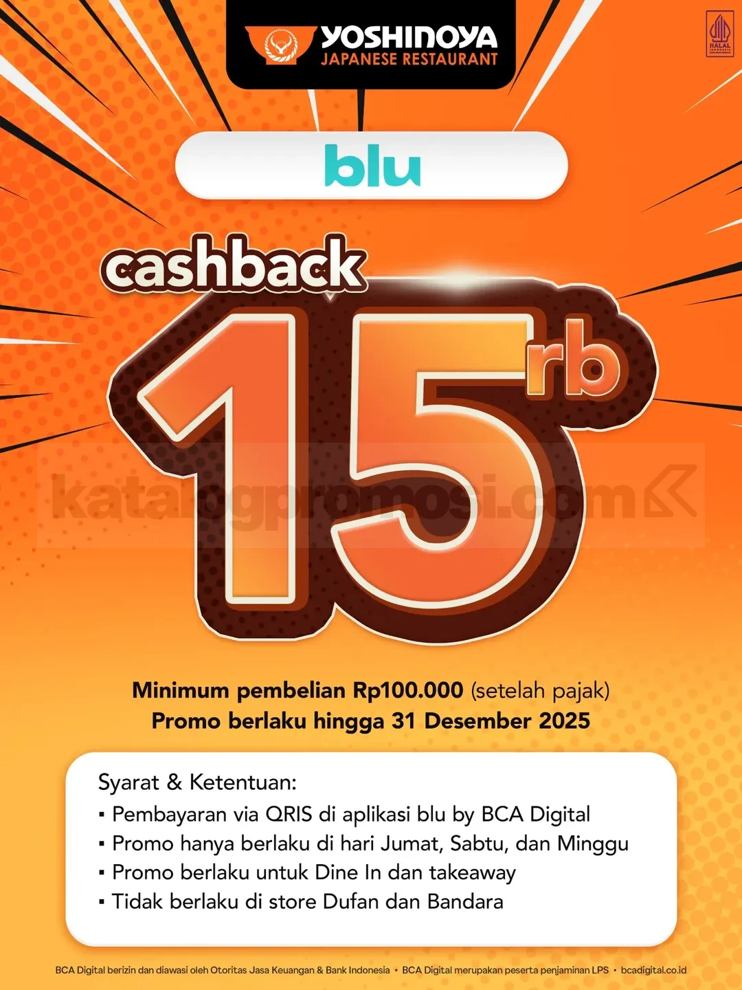 • Cashback Rp15.000 – blu by BCA Digital (hingga 31 Des 2025, min. belanja Rp100.000, berlaku Jumat–Minggu, dine in & takeaway).