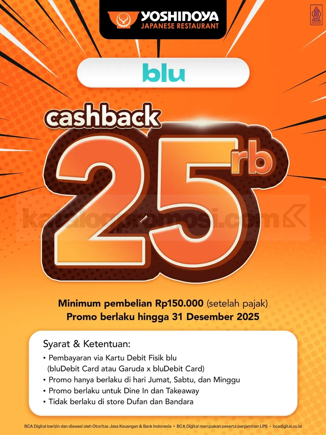 • Cashback Rp25.000 – blu Debit Card (hingga 31 Des 2025, min. Rp150.000, berlaku Jumat–Minggu, dine in & takeaway).