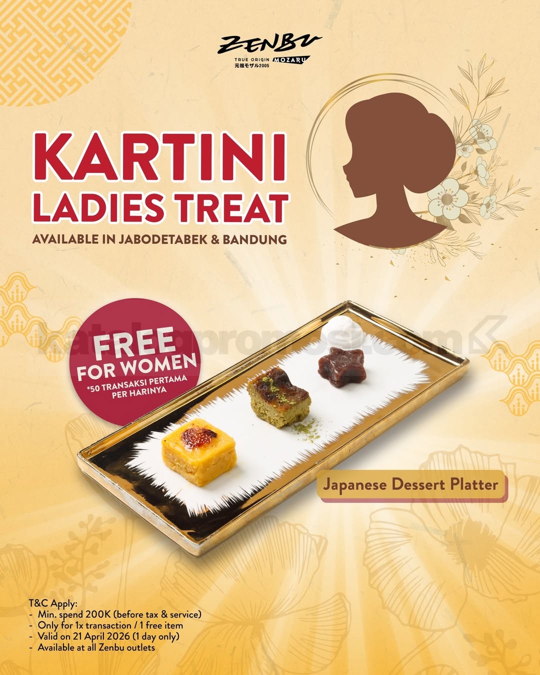 Promo Zenbu Hari Kartini Ladies Treat Gratis Menu berlaku 21 April 2026 gratis dessert untuk 50 transaksi pertama minimal pembelian Rp. 200.000 di outlet Zenbu