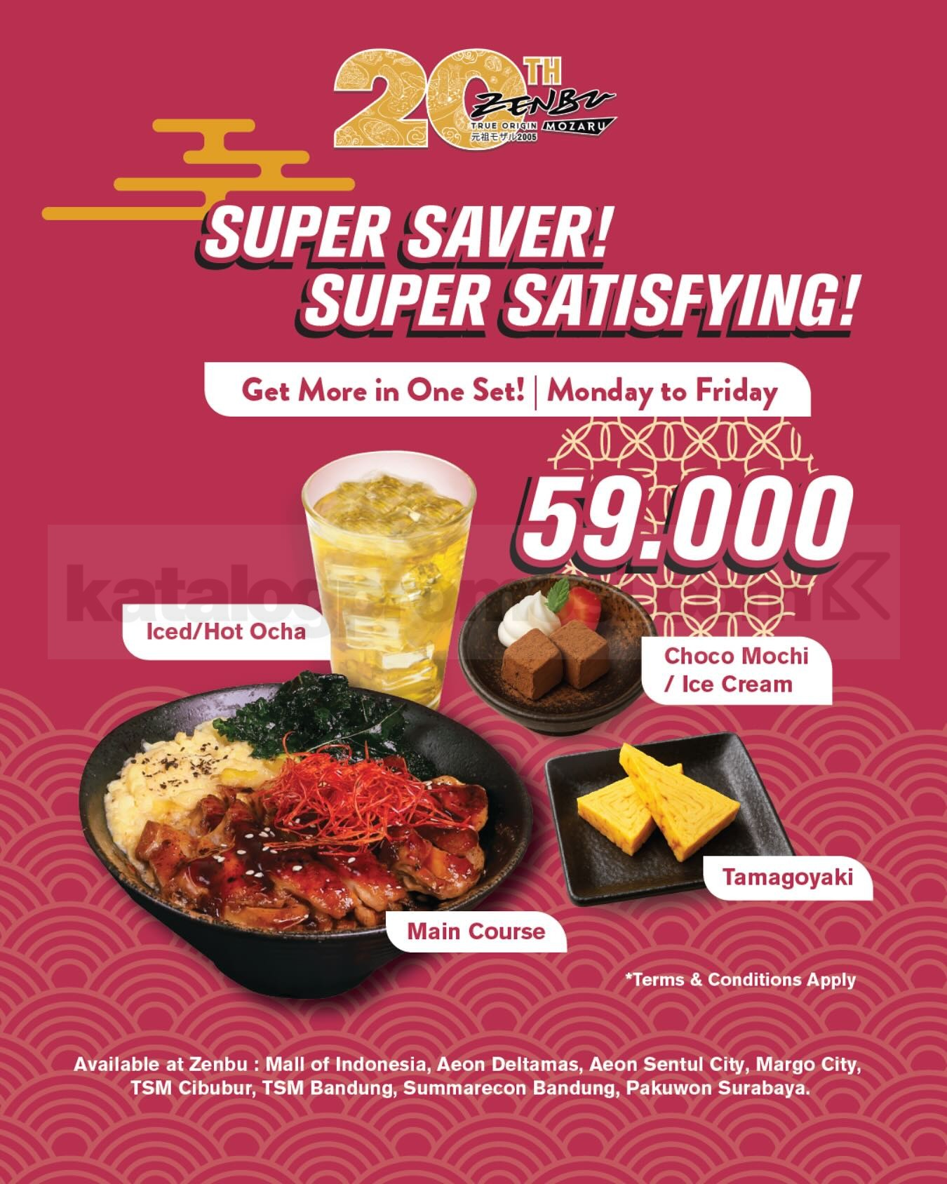 Promo Zenbu Paket Super Saver cuma Rp59.000! Dapat main course, minuman, side dish, dan dessert. Berlaku SeninโJumat. Hanya di outlet tertentu!