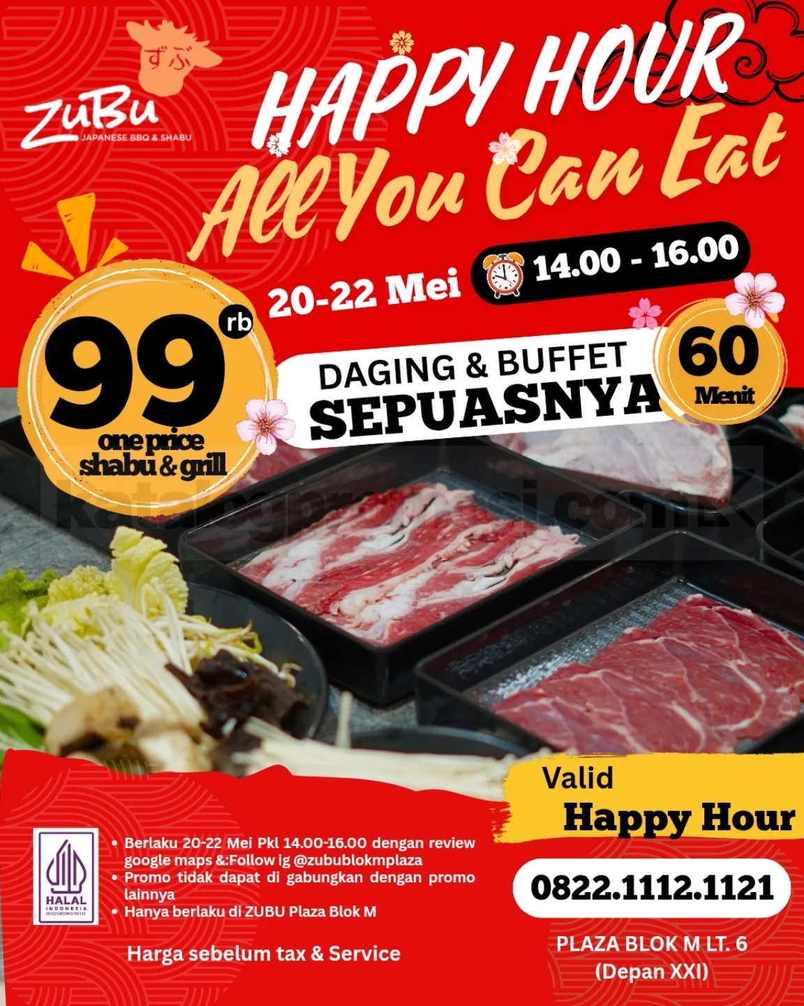 👉 Cek gambar promo ZUBU Happy Hour AYCE Rp99.000 di Blok M Plaza 20–22 Mei 2025 di bawah ini untuk lihat detail daging dan pilihan buffet-nya!