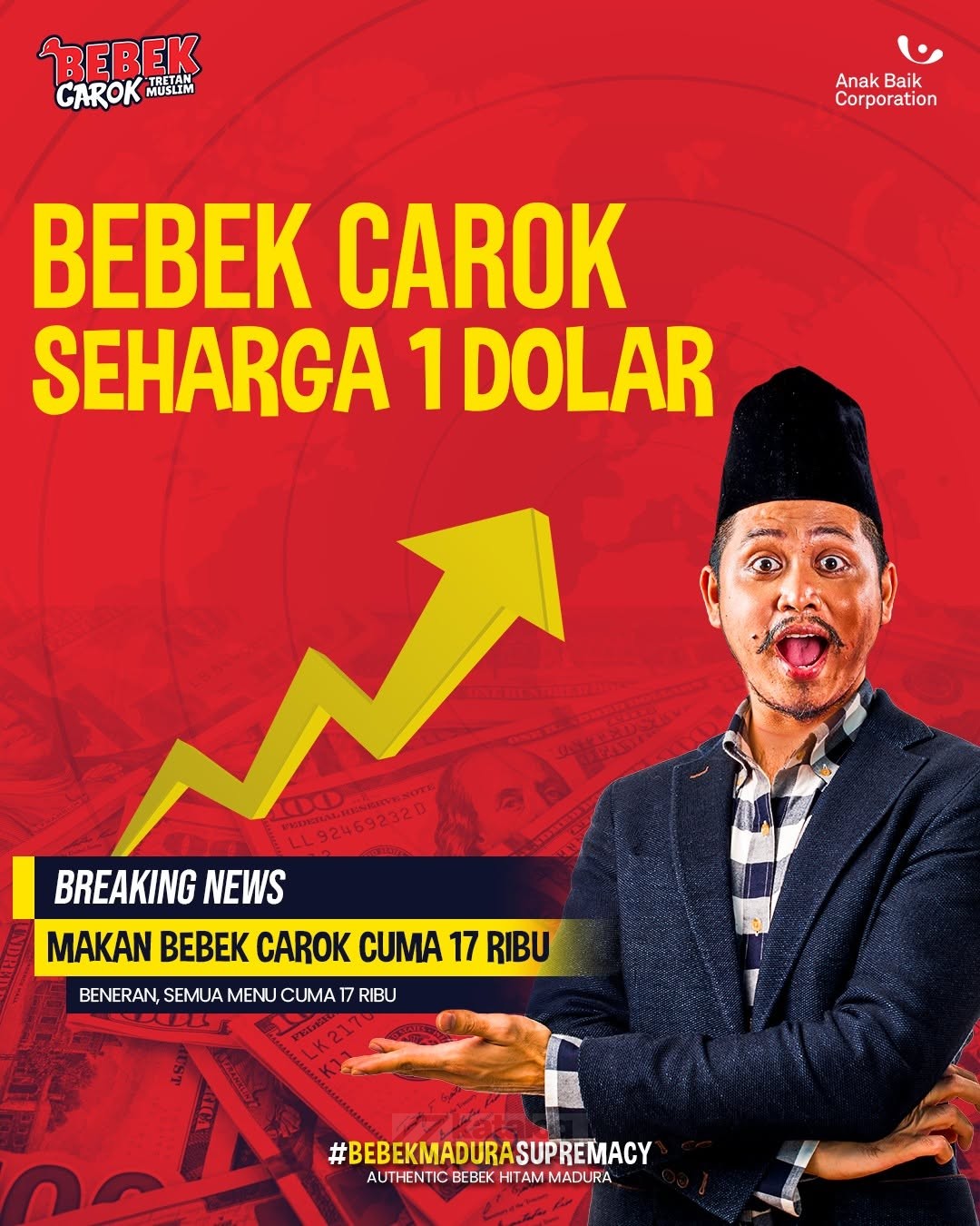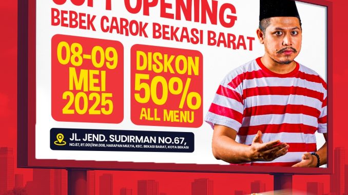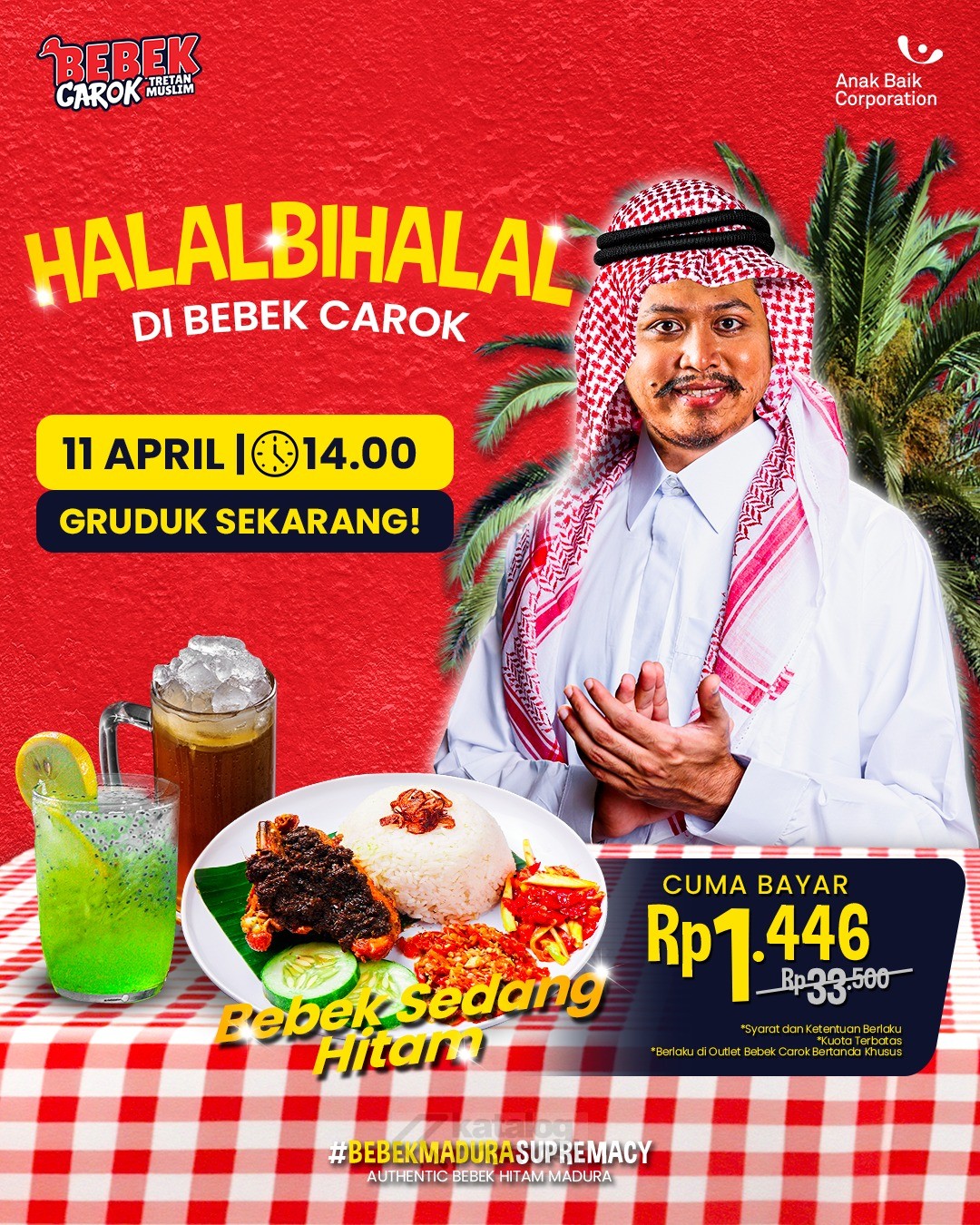 Promo Bebek Carok On Delivery Diskon 50% dengan minimum pembelian Rp. 100.000, pesan via WhatsApp, berlaku 15–21 Desember 2025.