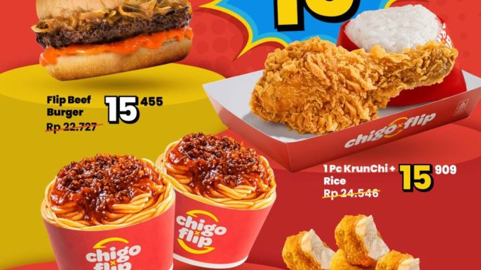 Promo Chigo x Flip Pick Your Flip Paket Hemat mulai Rp. 31.818 dengan beragam pilihan menu burger dan snack untuk jajan bareng, berlaku selama periode promo di outlet tertentu.