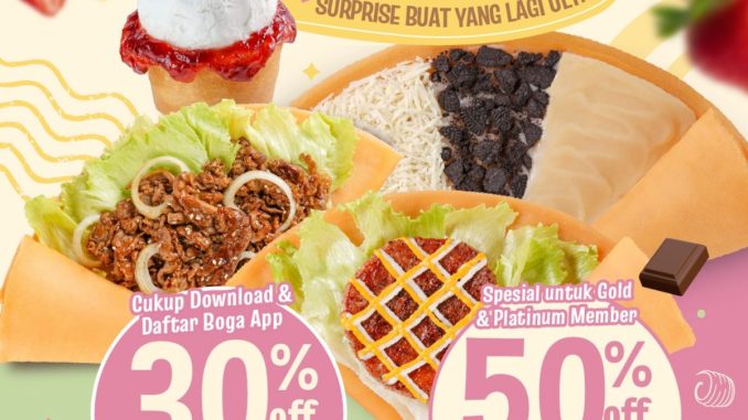 Promo Crêpe O’ Butter Birthday Treat Diskon hingga 50% berlaku untuk pelanggan yang berulang tahun dengan ketentuan membership Boga App di outlet Plaza Blok M.