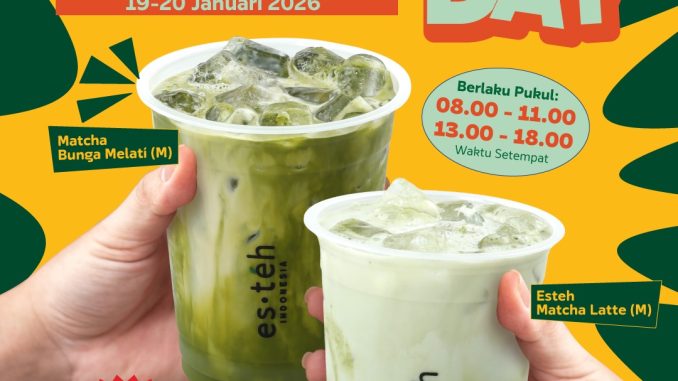 Promo Esteh Indonesia Brand Day Oriental Matcha Rp. 17.500 lewat GoFood dengan pilihan Matcha Bunga Melati dan Matcha Latte, berlaku mulai tanggal 19 Januari 2026 – 20 Januari 2026.