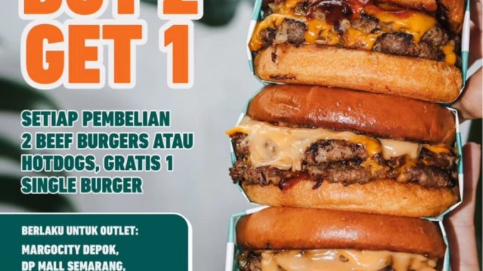 Promo Five Monkeys BUY 2 GET 1 Beef Burger dan Hotdogs, beli 2 menu langsung gratis 1 Single Burger, berlaku seharian penuh di outlet Five Monkeys.