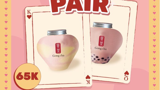 Promo Gong Cha Sweet Pair Strawberry Series Gratis Love Bottle Rp. 65 ribu pilih 2 menu strawberry favorit berlaku mulai tanggal 9 Februari 2026 – 15 Februari 2026 di seluruh outlet