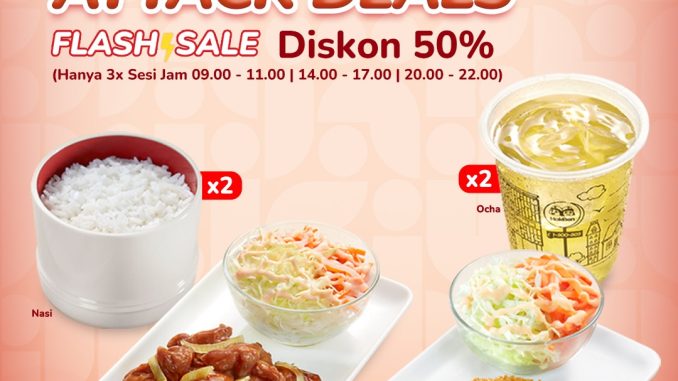 Promo HokBen GoFood Attack Deals Diskon 50% berlangsung 1 hari pada 30 November 2025 dengan tiga sesi pemesanan via GoFood untuk paket menu lengkap Nasi dan Cold Ocha.