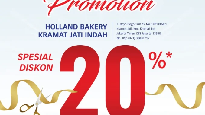 Promo Holland Bakery Grand Opening Kramat Jati Diskon 20% periode 21 – 27 Februari 2026 di outlet Kramat Jati Indah Jakarta Timur untuk pembelian langsung di counter.