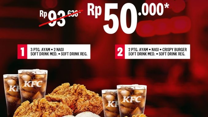 Promo KFC Kombo Spesial Roda Duo Rp50.000 eksklusif via Drive Thru dengan paket 2 ayam, 2 nasi, 2 soft drink, berlaku mulai sekarang di seluruh outlet KFC Drive Thru.