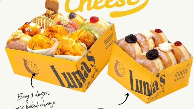 Promo Luna’s Doughnuts BUY 1 GET 1 Triple Baked Cheese Rp. 192.000 berlaku 19 – 26 Januari 2026, beli 1 lusin mix langsung dapat GRATIS 1/2 lusin classic di outlet tertentu.
