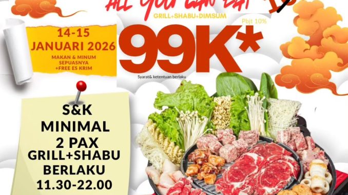 Promo Sakabe Buffet Sakaboom All You Can Eat Rp. 88.000 per orang makan grill dan shabu sepuasnya plus es krim, berlaku mulai tanggal 4 Februari 2026 – 5 Februari 2026.