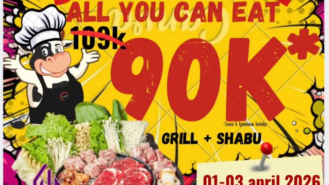 Promo Sakabe Buffet Sakaboom All You Can Eat Rp. 90.000 makan daging dan minum sepuasnya, berlaku mulai tanggal 9 April 2026 – 10 April 2026.
