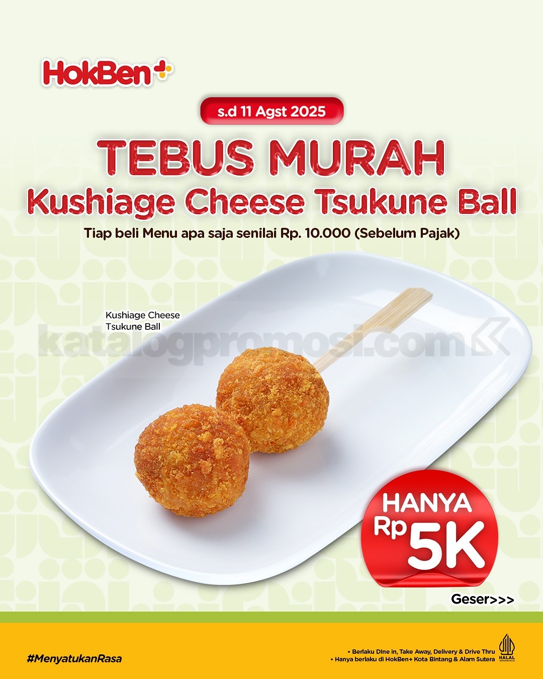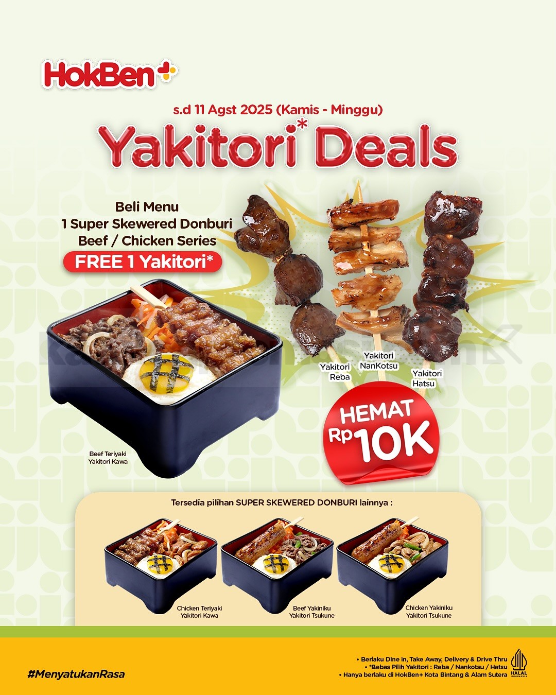 Promo HokBen+ Double Promo Kushiage & Yakitori dengan tiga pilihan hemat berlaku sampai 11 Agustus 2025 di outlet Grand Kota Bintang Bekasi dan Alam Sutera Tangerang.