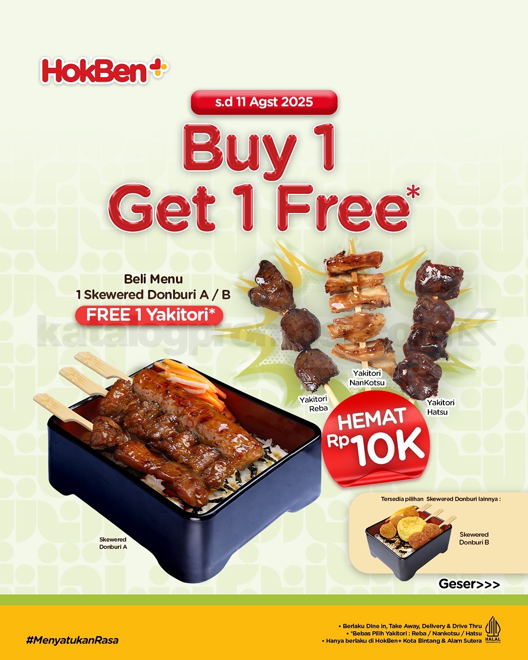 Ayo segera ke HokBen+ Grand Kota Bintang Bekasi dan Alam Sutera Tangerang untuk nikmati promo spesial ini. Jangan sampai kelewatan menu baru Super Skewered Donburi yang wajib banget dicoba!