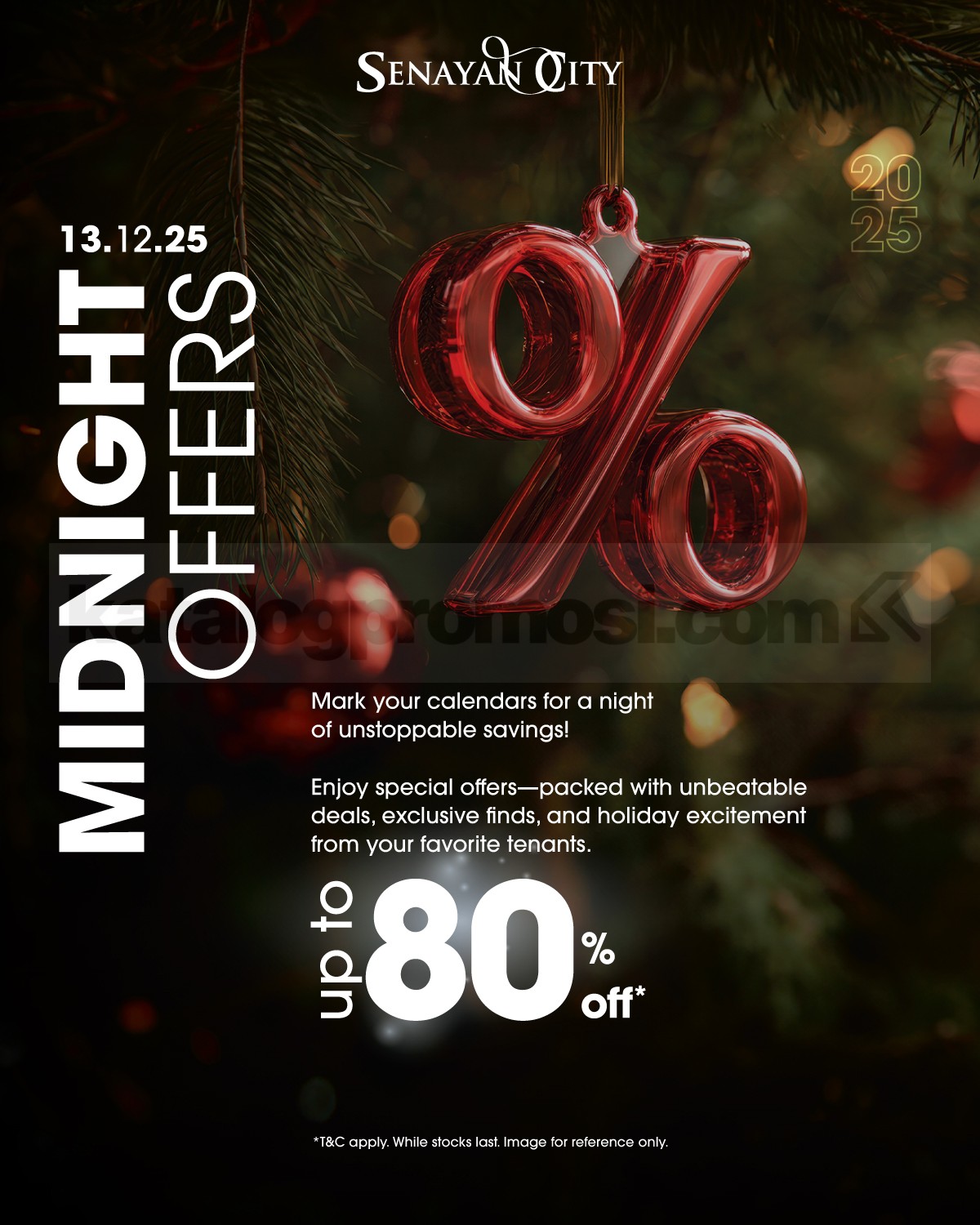 Yuk ikutan SENAYAN CITY Festive Midnight Shopping, cara belanja malam dibuat lebih maksimal dengan diskon besar, bonus poin, dan berbagai benefit eksklusif. Khusus satu malam di tanggal 13 Desember 2025, midnight offers dengan potongan harga hingga 80% bisa kamu temukan di tenant tertentu.