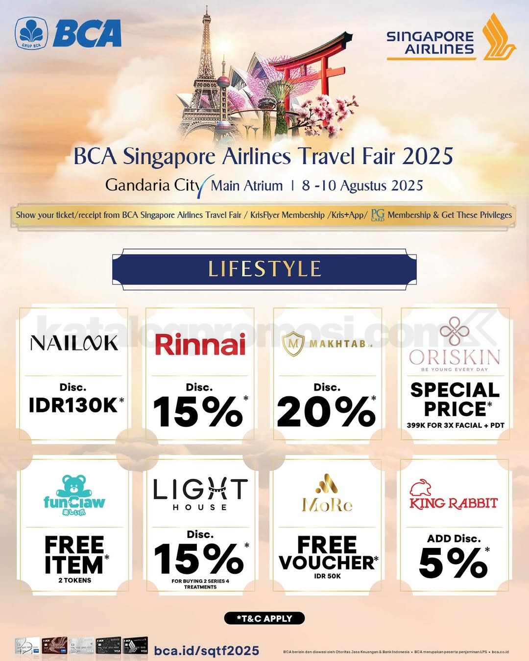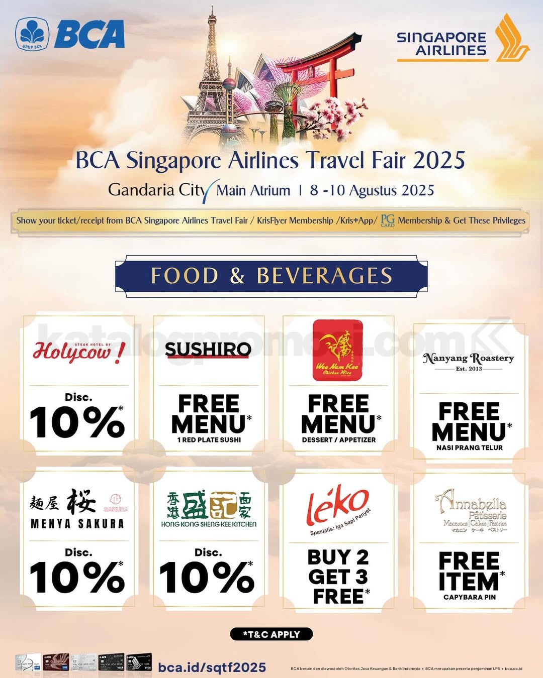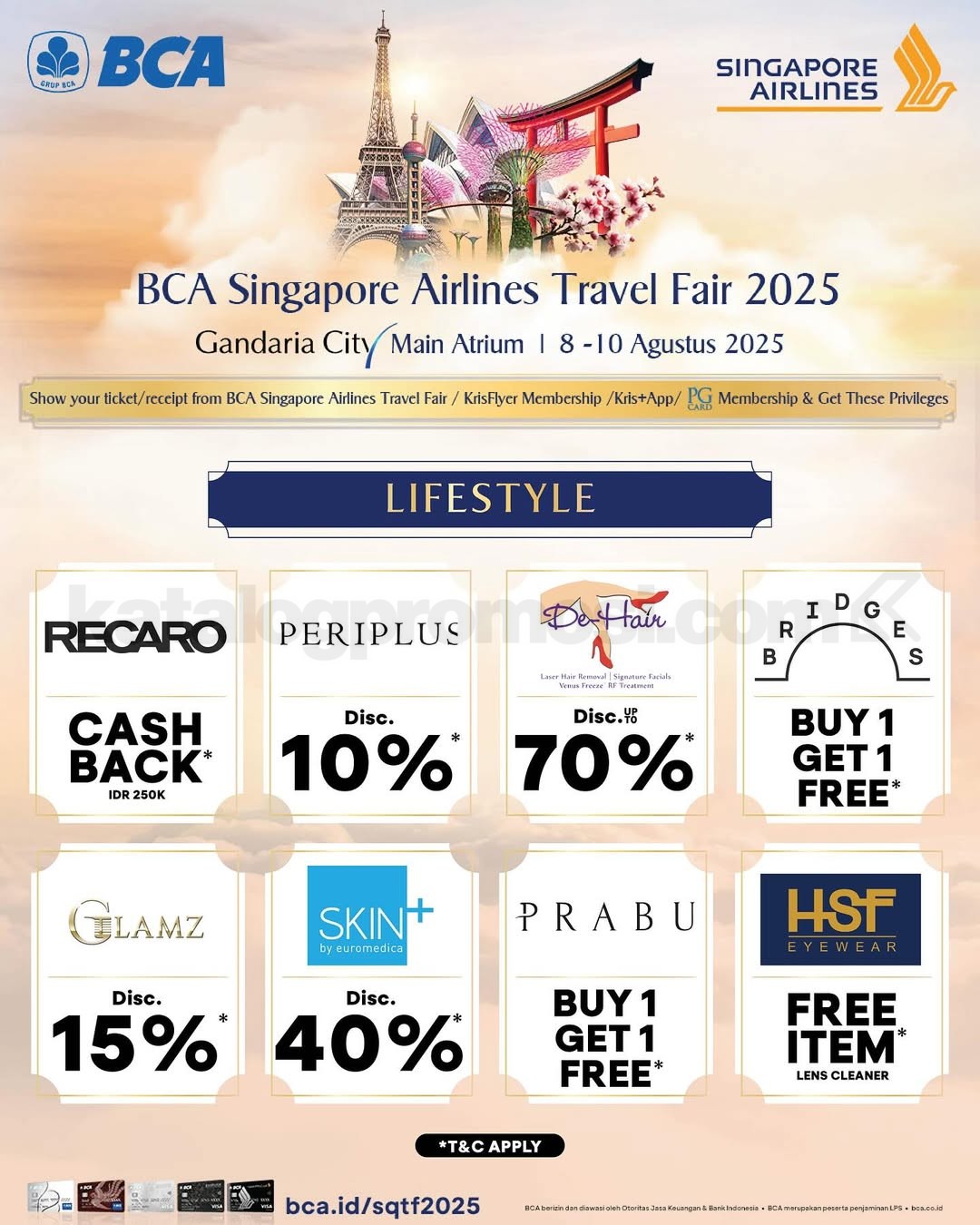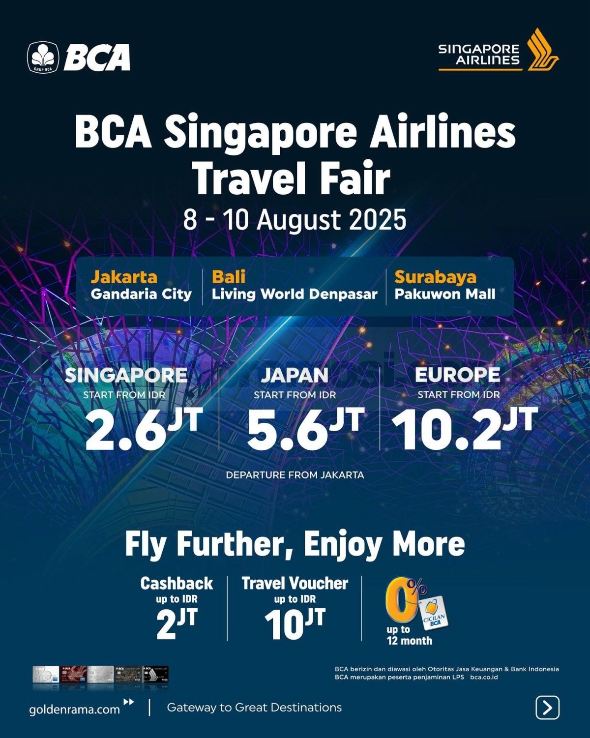 Singapore Airlines BCA Travel Fair 2025 akan kembali hadir pada tanggal 8–10 Agustus 2025 di empat kota besar di Indonesia. Bersiaplah menjelajahi destinasi impianmu dengan penawaran harga spesial, fasilitas eksklusif, dan promo istimewa untuk pemegang kartu BCA.