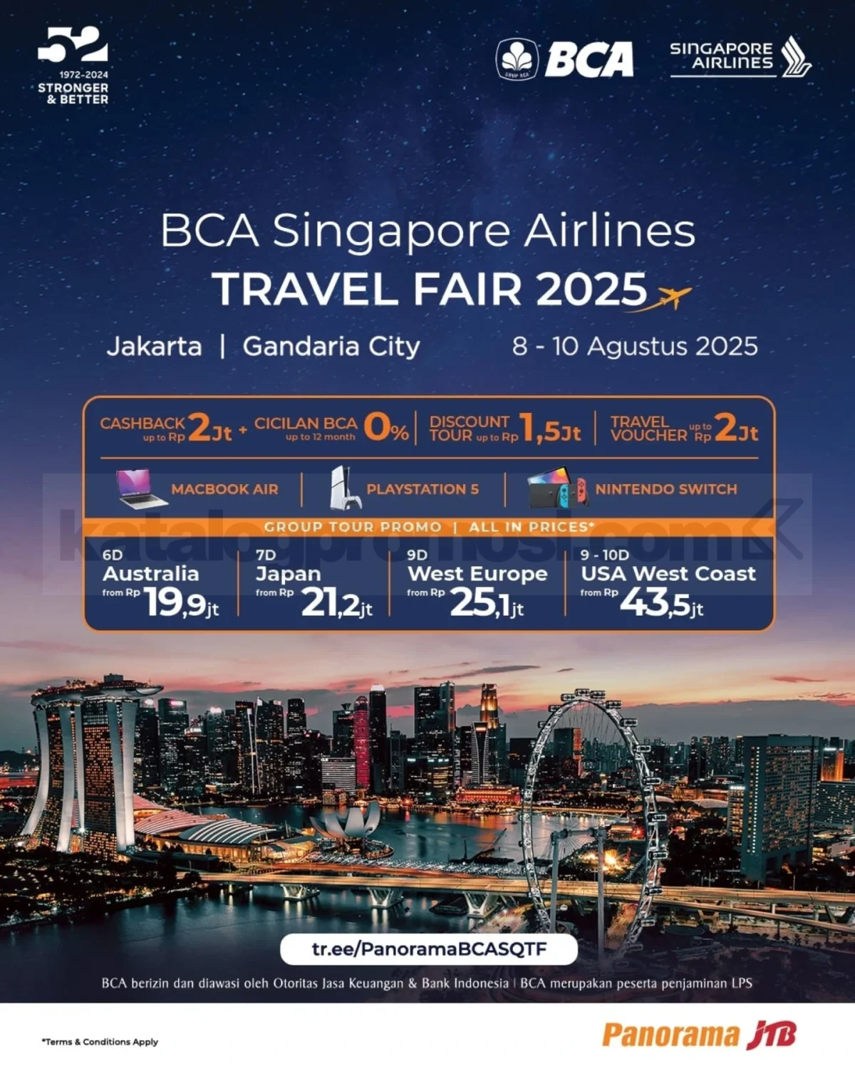 Kalau kamu lagi rencanain liburan ke Jepang, Amerika Serikat, atau destinasi Cathay lainnya, travel fair ini wajib masuk to-do list kamu! Harga spesial, fasilitas eksklusif untuk nasabah BCA, dan banyak benefit lainnya cuma bisa kamu dapat selama 3 hari. Jangan lupa cek juga daftar agen untuk pre-book mulai 15 Juli ya!