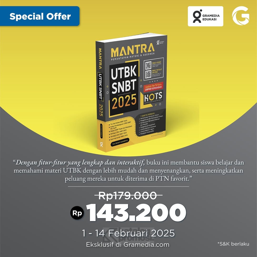 Sekarang kamu bisa dapetin MANTRA UTBK SNBT 2025 dengan harga spesial hanya Rp143.200! Promo ini berlaku hingga 14 Februari 2025, jadi jangan sampai kelewatan. Dengan buku ini, kamu nggak cuma belajar teori, tapi juga strategi jitu buat taklukin soal-soal UTBK yang terkenal tricky.