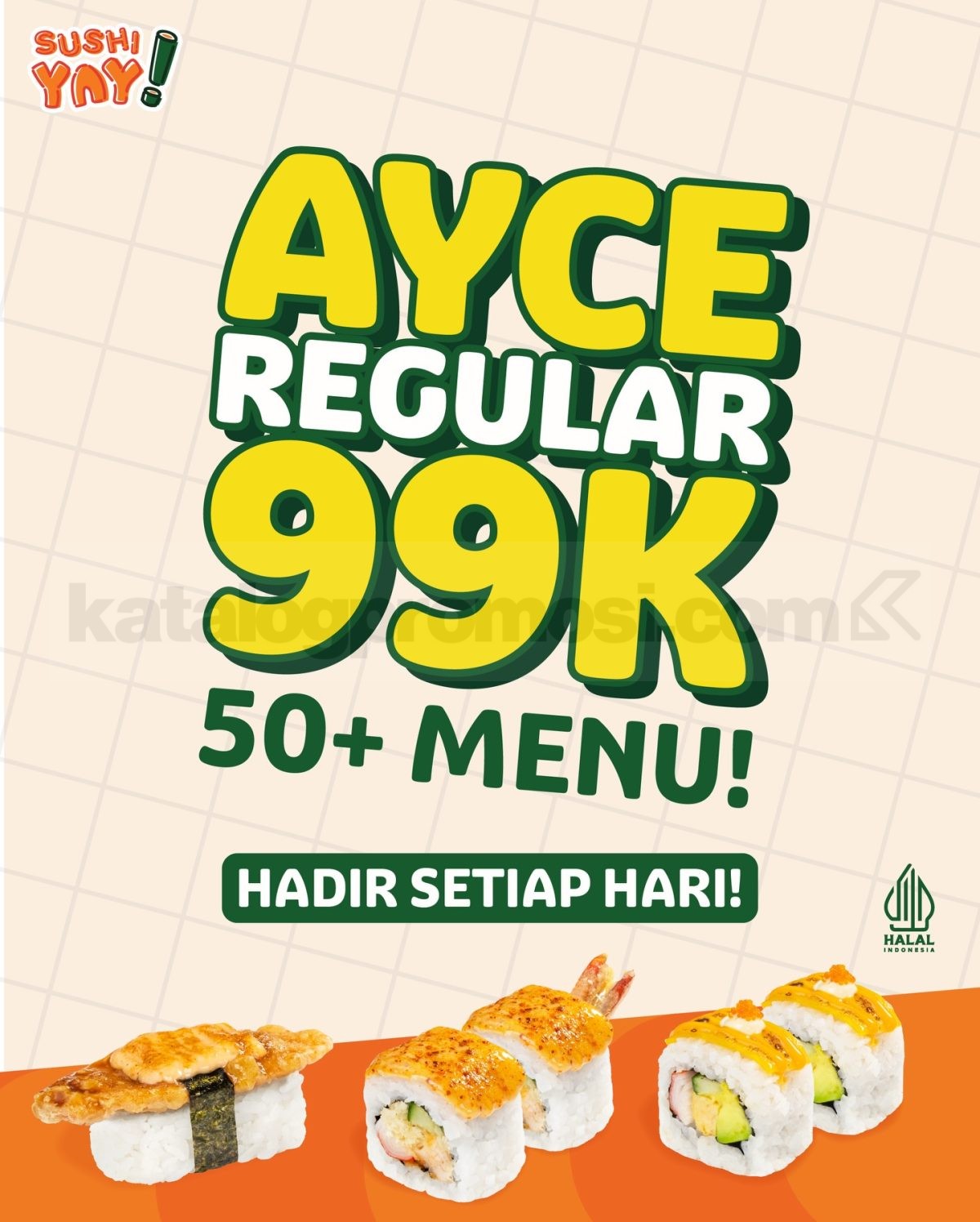 Promo Sushi Yay! AYCE Regular 50+ menu, nikmati semua menu sushi sepuasnya dengan harga mulai Rp. 99.000, berlaku di seluruh outlet.