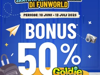 Promo Funworld Liburan Akhir Tahun Bonus 75% Goldie dan Lucky Dip, main makin seru dengan bonus ekstra, berlaku mulai tanggal 15 Desember 2025 – 4 Januari 2026 di seluruh outlet.