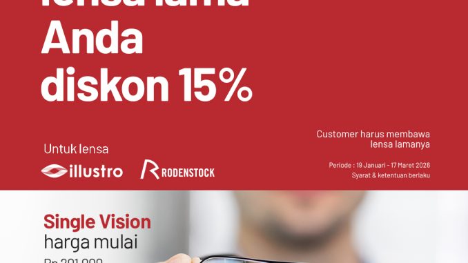 Promo Optik Melawai Tukar Lensa Lama Diskon 15% mulai Rp. 171.000 ganti lensa Illustro dan Rodenstock dengan frame lama berlaku mulai tanggal 19 Januari 2026 – 17 Maret 2026 di seluruh outlet.