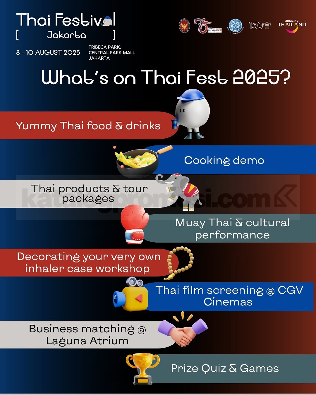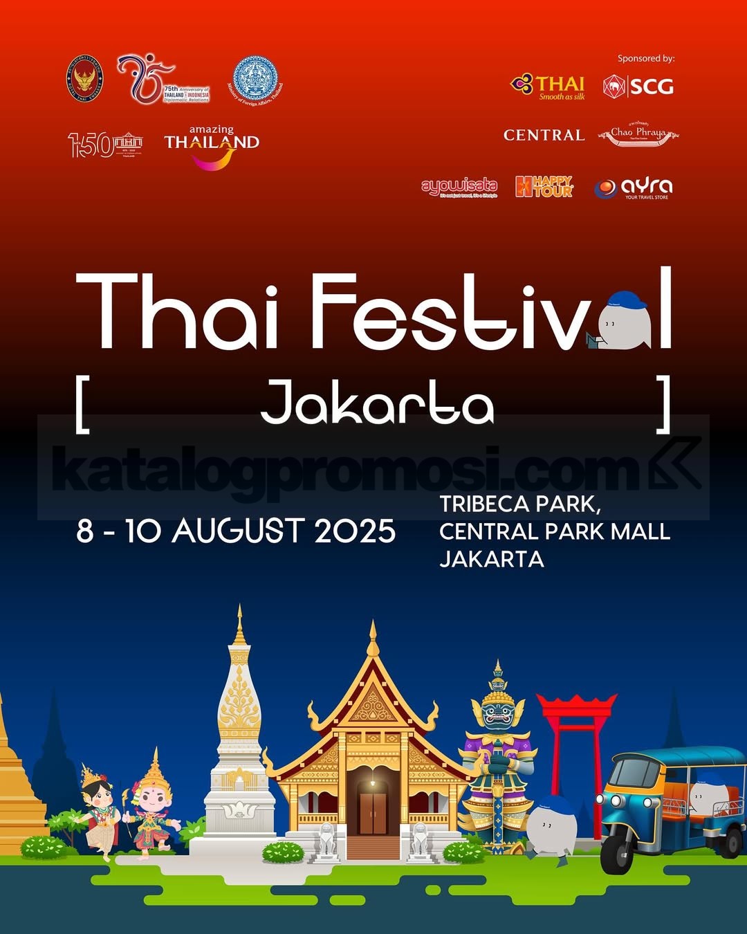 Thai Festival 2025 di Central Park Jakarta, mulai tanggal 8โ10 Agustus! Nikmati kuliner Thailand, workshop seru, film gratis, hingga undian tiket ke Bangkok. Cek info lengkapnya!