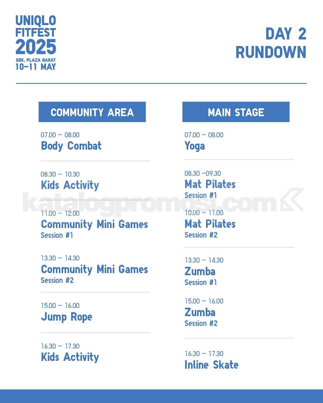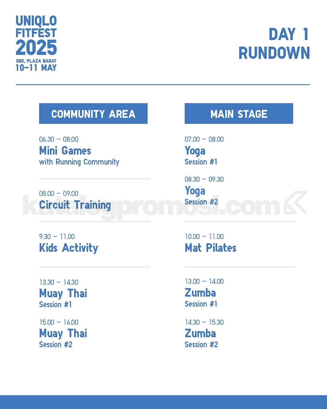 UNIQLO Indonesia kembali menggelar UNIQLO FitFest 2025, festival olahraga gratis yang berlangsung pada Sabtu–Minggu, 10–11 Mei 2025 di Plaza Barat Gelora Bung Karno (GBK), Jakarta. Acara ini menghadirkan berbagai kelas olahraga, kompetisi, dan aktivitas seru untuk semua kalangan.