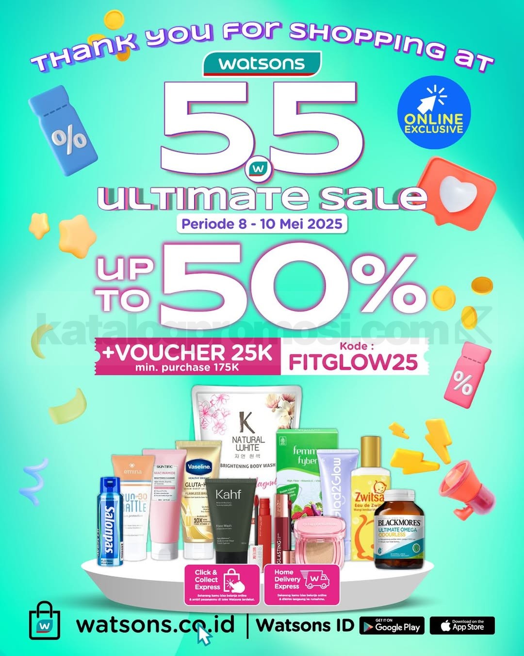 Watsons 5.5 Thank You Sale Diskon hingga 50% + Voucher 25K.