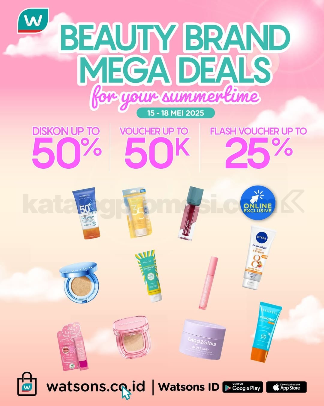 ✨ Lagi ada yang spesial buat kamu para beauty lovers! Di Watsons Beauty Brand Mega Deals, kamu bisa belanja produk kecantikan favorit—mulai dari sunscreen, cushion, lip tint, sampai lotion—dengan diskon sampai 50%, plus voucher hingga Rp50 ribu dan flash voucher hingga 25%. 💸