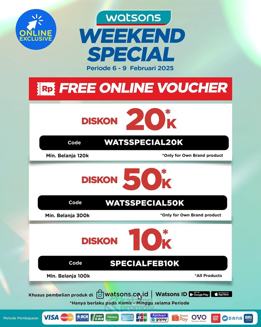 Watsons WEEKEND SPECIAL – dapatkan FREE Online Voucher hingga 50K. Berlaku hingga 09 Februari 2025.